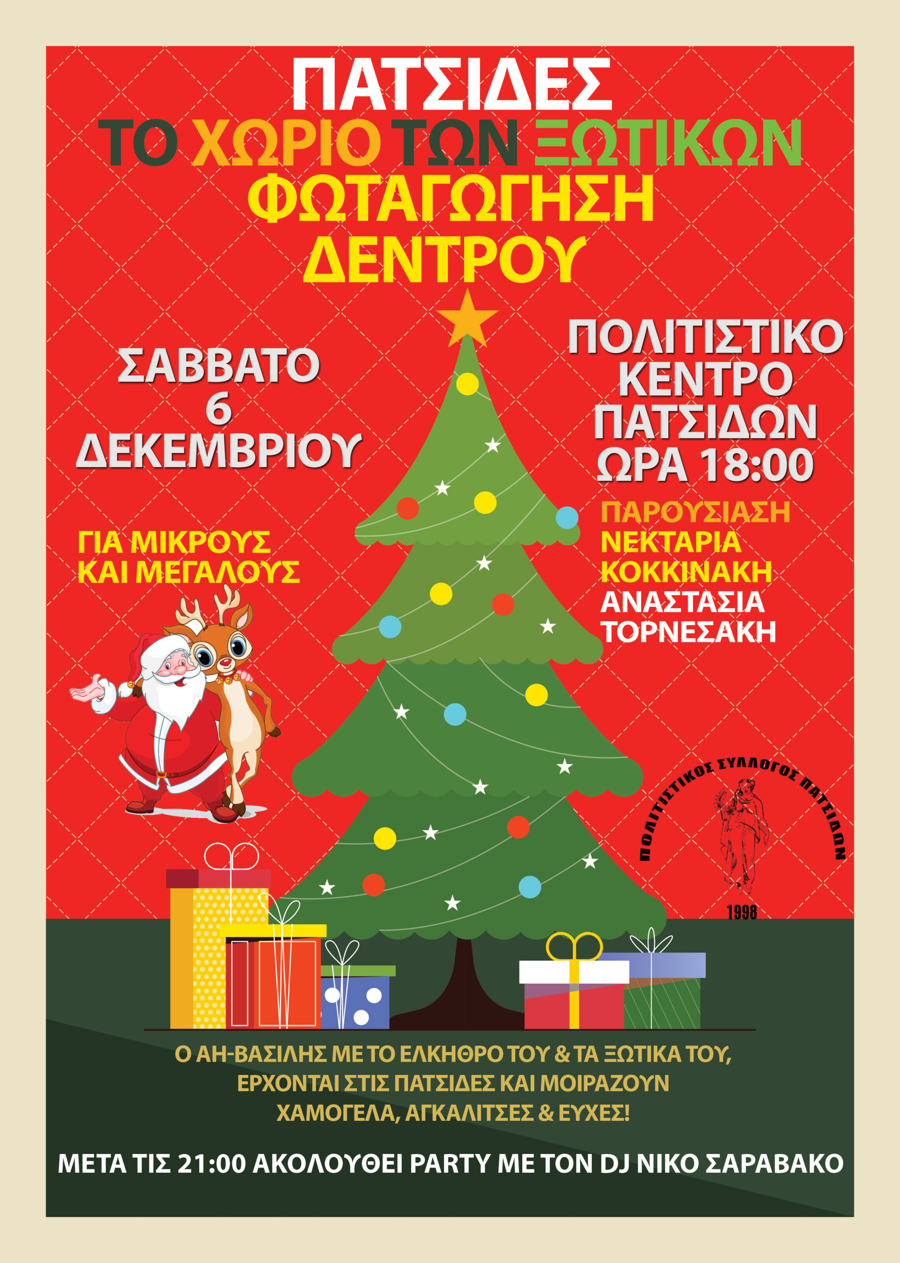 Το Σάββατο 6 Δεκεμβρίου στις 19.00 η Φωταγώγηση του Χριστουγεννιάτικου Δέντρου στο Πολιτιστικό Κέντρο Πατσίδων. Υποδεχόμαστε από τις 18.00 τον Άγιο Βασίλη με το έλκηθρο και τα Ξωτικά του,τους Ήρωες της Ντίσνευ, ο Stich και η Angel το Ξωτικό των Χριστουγέννων για να γράψουν μαζί με τα παιδιά γράμματα στον Άγιο Βασίλη μας!