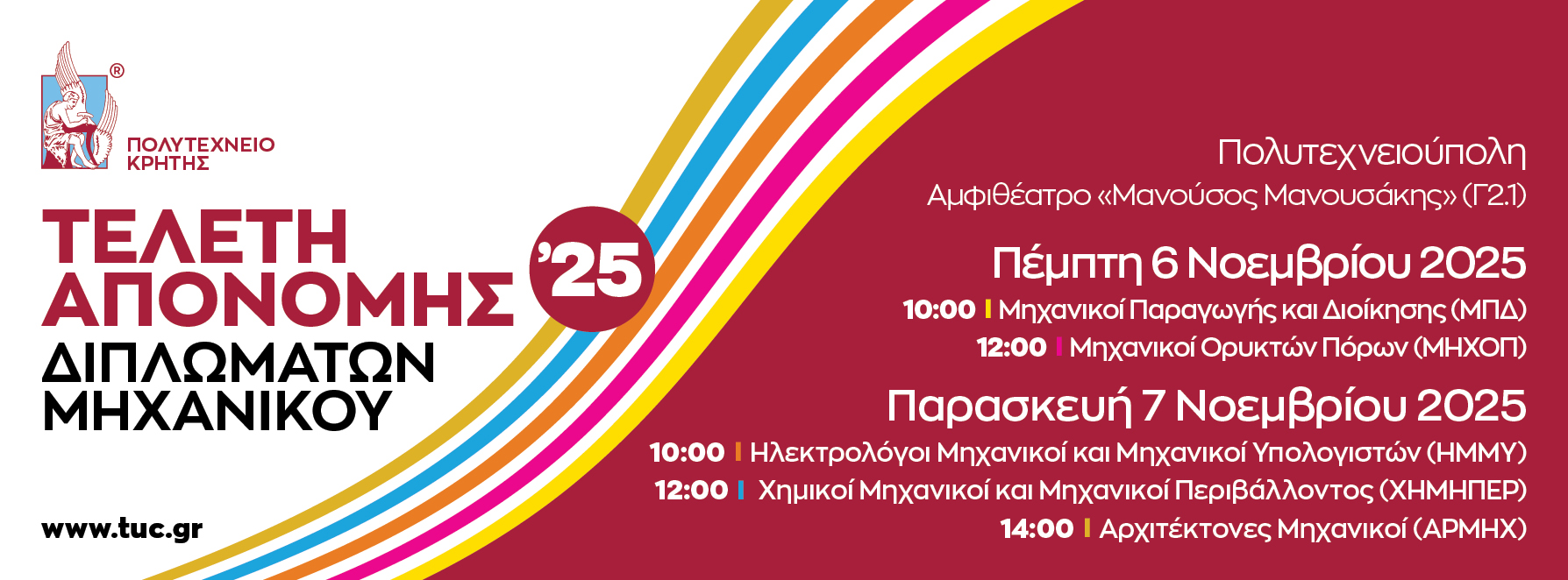 Η Τελετή Απονομής Διπλωμάτων Μηχανικού του Πολυτεχνείου Κρήτης, για την ανακήρυξη της επαναληπτικής εξεταστικής του ακαδημαϊκού έτους 2024-2025, θα πραγματοποιηθεί την Πέμπτη 6 Νοεμβρίου 2025 και την Παρασκευή 7 Νοεμβρίου 2025 στην Πολυτεχνειούπολη.
