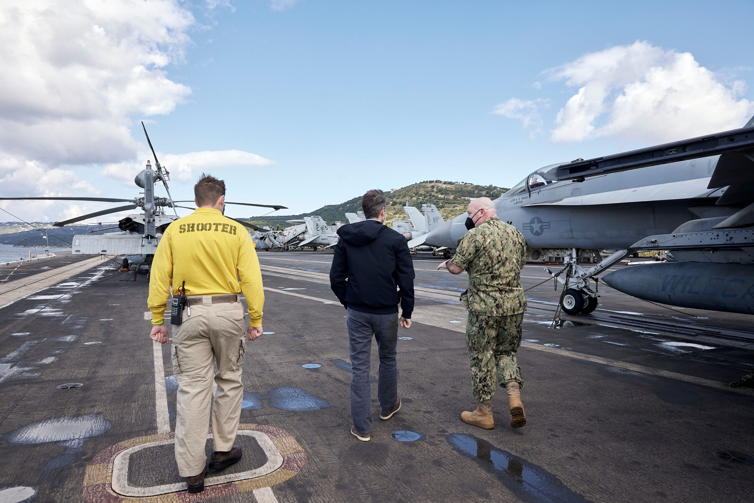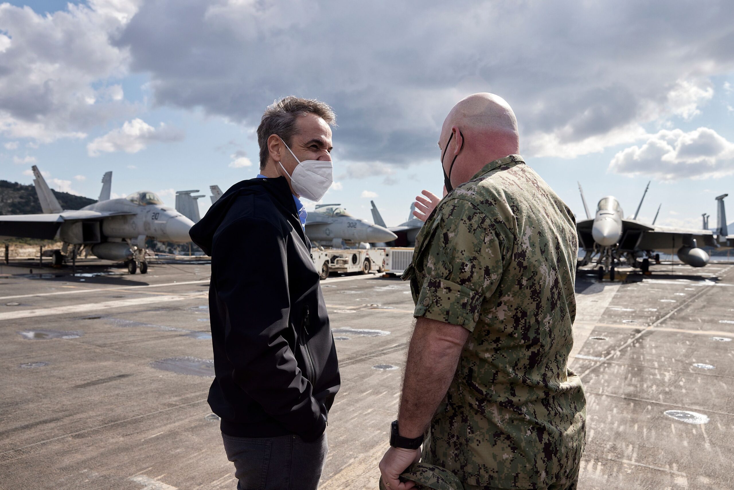 Στη συνέχεια, ο Πρωθυπουργός περπάτησε στο κατάστρωμα και στον διάδρομο απονήωσης και προσνήωσης, όπου βρίσκονταν «παρατεταγμένα» μαχητικά αεροπλάνα F/A-18. Ενημερώθηκε για τις επιχειρησιακές δυνατότητες του αεροπλανοφόρου, τον οπλισμό του και τους μηχανισμούς που διαθέτει για την ασφαλή απονήωση και προσνήωση αεροσκαφών που κινούνται με εξαιρετικά μεγάλες ταχύτητες. Σημειώθηκε επίσης η εξαιρετική συνεργασία ανάμεσα στις ένοπλες δυνάμεις της Ελλάδας και των ΗΠΑ, με κορωνίδα τη Σούδα, για την προάσπιση κοινών αξιών και συμφερόντων στην ευρύτερη περιοχή.