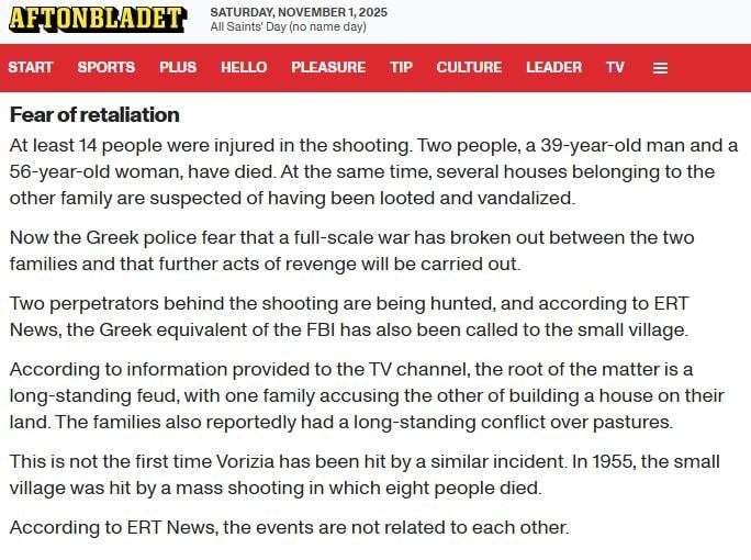 To σουηδικό Μέσο κάλυψε την βεντέτα με αναφορές στην κόντρα μεταξύ των δύο οικογενειών και την παρουσία στην περιοχή του ελληνικού FBI.
