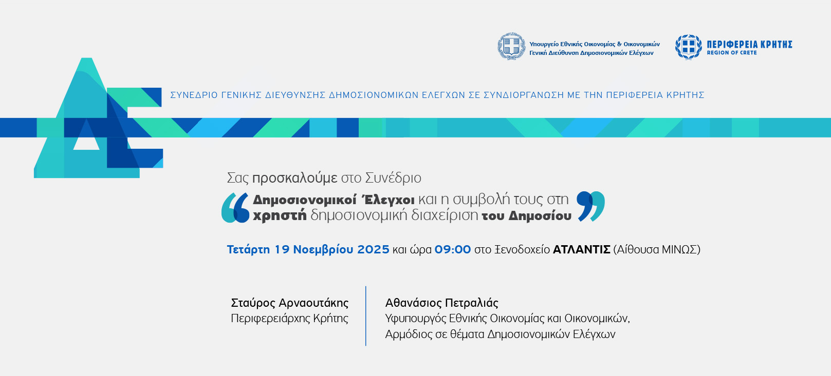 Το Υπουργείο Εθνικής Οικονομίας και Οικονομικών-Γενική Διεύθυνση Δημοσιονομικών Ελέγχων και η Περιφέρεια Κρήτης συνδιοργανώνουν συνέδριο με θέμα: Δημοσιονομικοί Έλεγχοι και η συμβολή τους στη χρηστή δημοσιονομική διαχείριση του Δημοσίου.