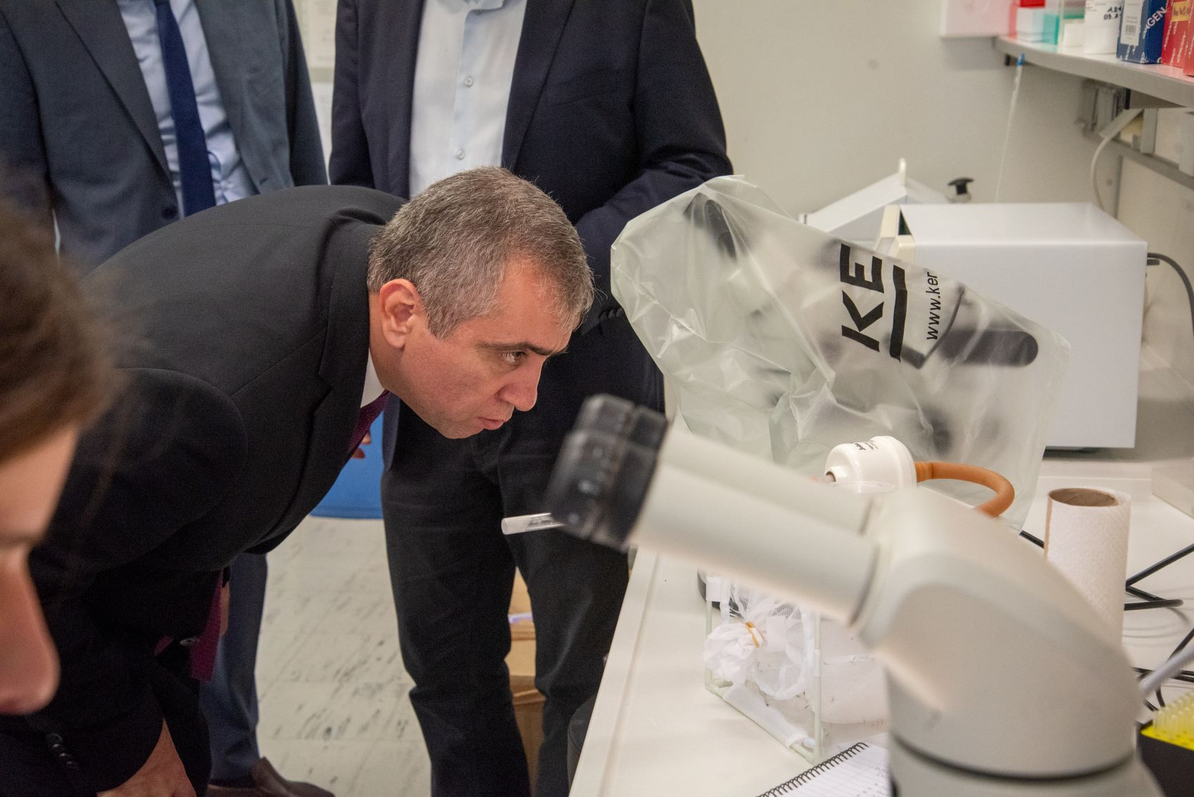 Στη συνέχεια, ξεναγήθηκε στο εργαστήριο με αντικείμενο Έντομα και τις Νόσους Μεταδιδόμενες από Φορείς του Ινστιτούτου Μοριακής Βιολογίας και Βιοτεχνολογίας, το οποίο επικεντρώνεται στη μοριακή ανάλυση των μηχανισμών ανθεκτικότητας των εντόμων υγειονομικής και γεωργικής σημασίας στα εντομοκτόνα, με σκοπό την ανάπτυξη εφαρμογών για τη διαχείριση και αντιμετώπιση του φαινομένου.