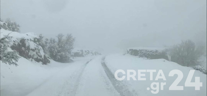 Λίγο πάνω από τα Ανώγεια μάλιστα το ύψος του χιονιού φτάνει τους 30 πόντους.
