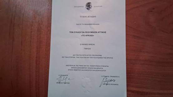 Αξίζει να αναφερθεί ότι η εν λόγω απονομή περιποιεί εξαίρετο τιμή για τον ιστορικό σύλλογο Ρεθυμνίων Αττικής “ΤΟ ΑΡΚΑΔΙ” , αφού από τον χώρο των πολιτιστικών σωματείων της Κρήτης ίσως είναι ο μοναδικός που έλαβε αυτην την διάκρισιν και μάλιστα Οίκοθεν.
