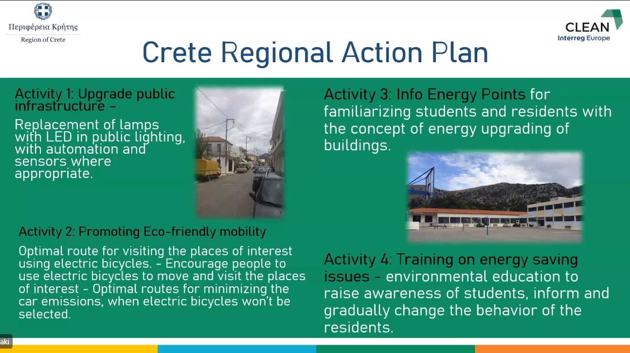 Για την Περιφέρεια Κρήτης, η συντονίστρια του έργου Μαρία Αποστολάκη παρουσίασε τη πρόταση της Περιφέρειας για τη μετατροπή μιας αγροτικής περιοχής σε χαμηλού άνθρακα, συνδυάζοντας δράσεις οδοφωτισμού, μεταφορών, περιβαλλοντικής εκπαίδευσης και ενημέρωσης των κατοίκων της περιοχής. Το Οροπέδιο Λασιθίου, που έχει επιλεγεί για την υλοποίηση του έργου CLEAN, αποτελεί μια ορεινή αγροτική περιοχή με έντονη αγροτική και τουριστική ανάπτυξη και ταυτόχρονα πολλές δυνατότητες ενεργειακής αναβάθμισης και συμβολής στην προσπάθεια της ενεργειακής μετάβασης του νησιού. Μέσα από το Σχέδιο Δράσης του έργου CLEAN, η Περιφέρεια Κρήτης συνεργάζεται με το Δήμο Οροπεδίου Λασιθίου για την εφαρμογή λύσεων χαμηλού άνθρακα, ενεργειακής αποδοτικότητας και τεχνολογιών στην κινητή τηλεφωνία, τα οποία μπορούν να χρησιμοποιηθούν για να αλλάξει θετικά η ενεργειακή συμπεριφορά των πολιτών για μια πιο έξυπνη και ενεργειακά πιο αποδοτική περιοχή.