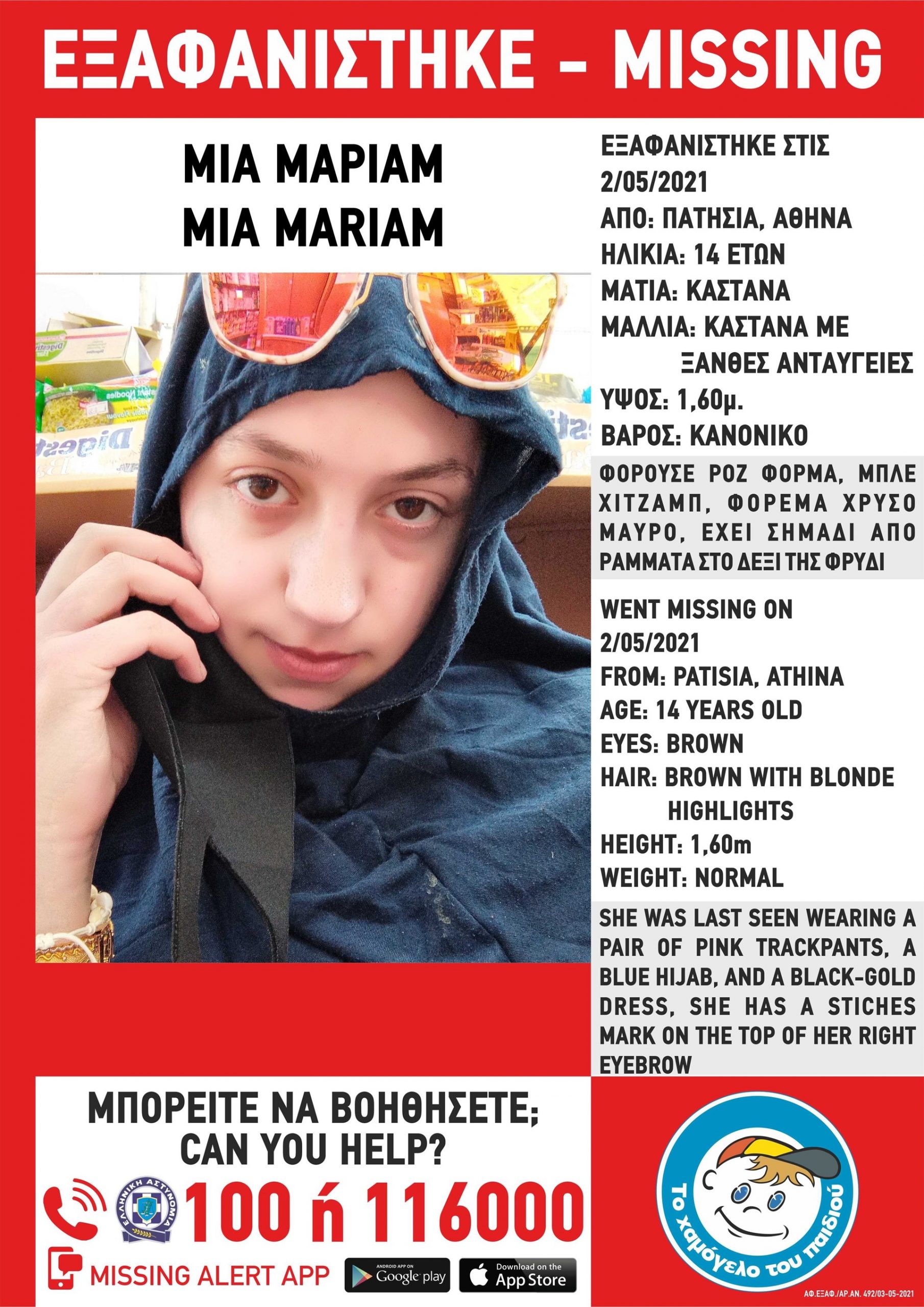 Η 14χρονη έχει ύψος 1,60 μ., έχει κανονικό βάρος, έχει καστανά μαλλιά με ξανθές ανταύγειες, καστανά μάτια και ένα σημάδι από ράμματα στο δεξί της φρύδι. Όταν χάθηκαν τα ίχνη της, φορούσε ροζ φόρμα, μπλε χιτζάμπ και μαύρο-χρυσό φόρεμα.