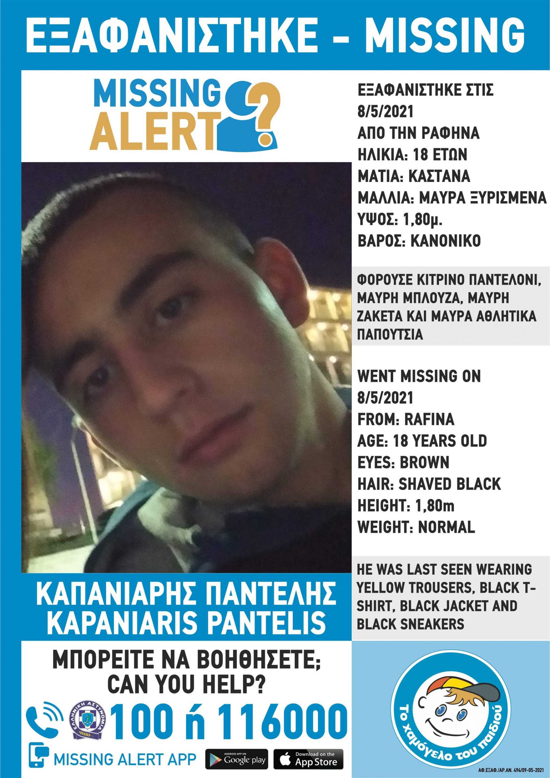 Εξαφανίστηκε από την περιοχή της Ραφήνας, το Σάββατο 8 Μαΐου ο 18χρονος Παντελής Καπανιάρης.
