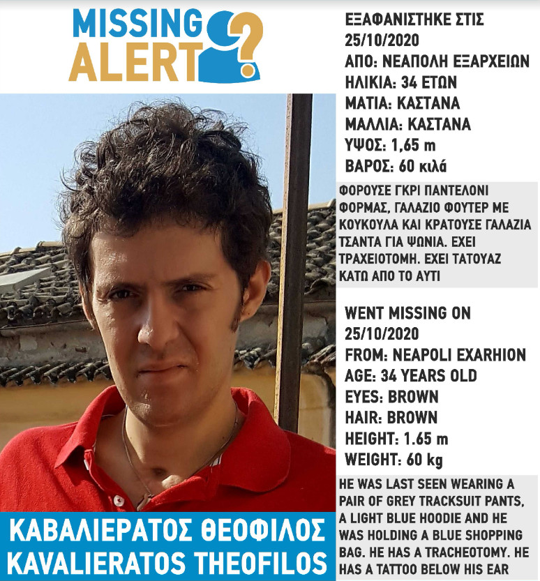 Πρόκειται για τον Θεόφιλο Καβαλιεράτο, ο οποίος αγνοείται από την Κυριακή (25.10.2020). Η οικογένειά του ανησυχεί καθώς ίσως η ζωή του να βρίσκεται σε κίνδυνο.