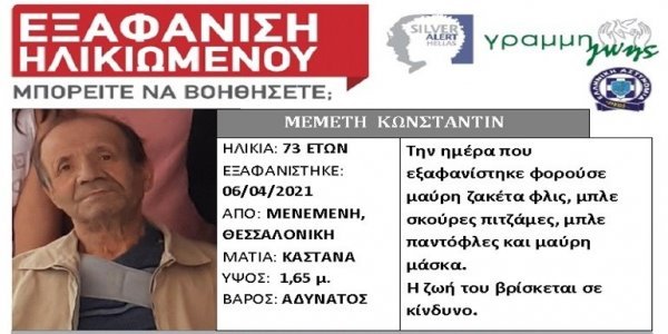 Πρόκειται για τον Μεμέτη Κωνσταντίν, ηλικίας 73 ετών, ο οποίος από την Τρίτη έχει εξαφανιστεί. Έχει καστανά μάτια, ύψος 1,65μ και είναι αδύνατος.