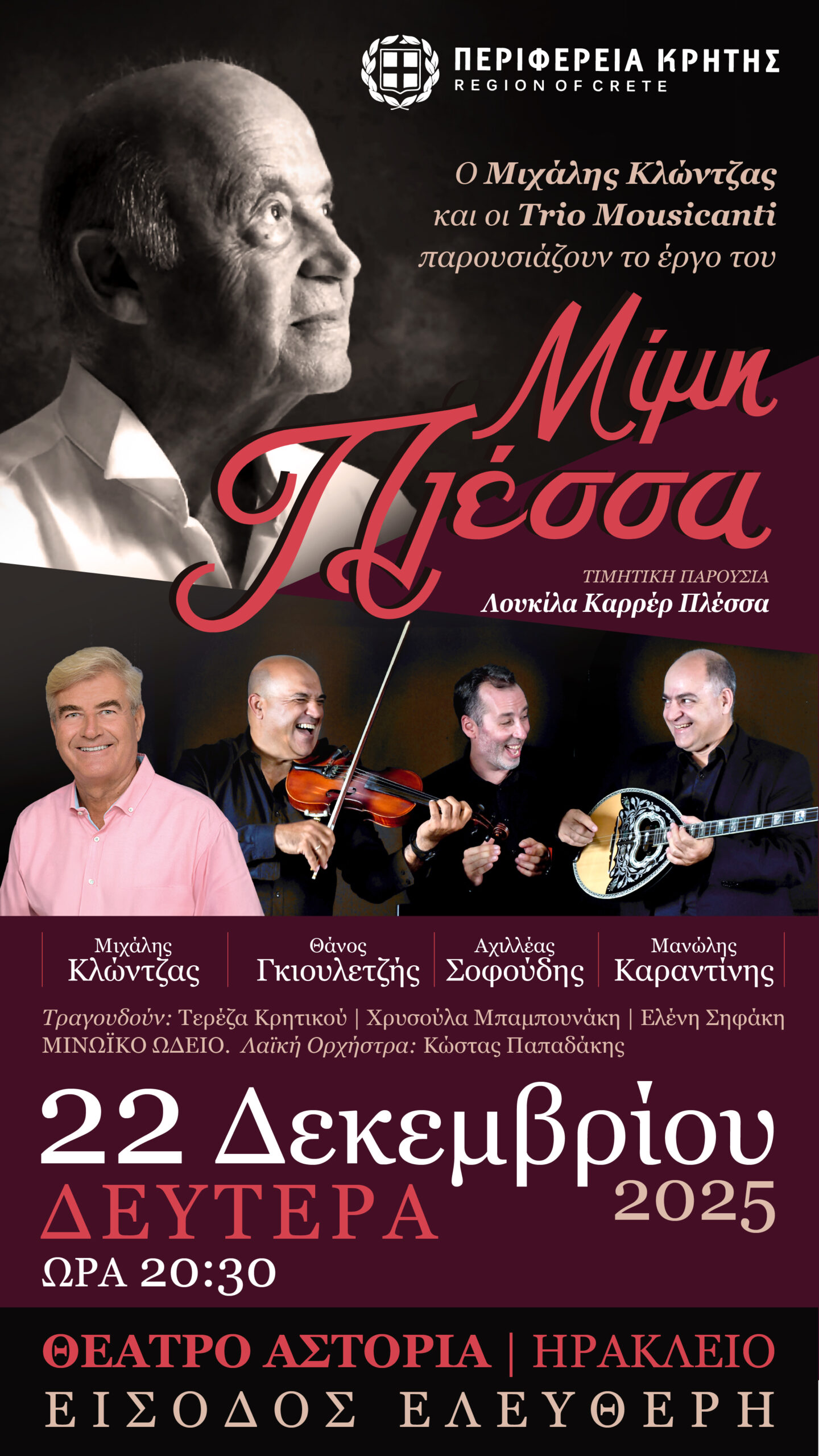 Συναυλία-αφιέρωμα στον αξέχαστο Μίμη Πλέσσα θα πραγματοποιηθεί με την στήριξη της Περιφέρειας Κρήτης οργανωμένη από τον Μιχάλη Κλώντζα και την Λουκίλα Καρρέρ-Πλέσσα, σύζυγο του μουσικοσυνθέτη.