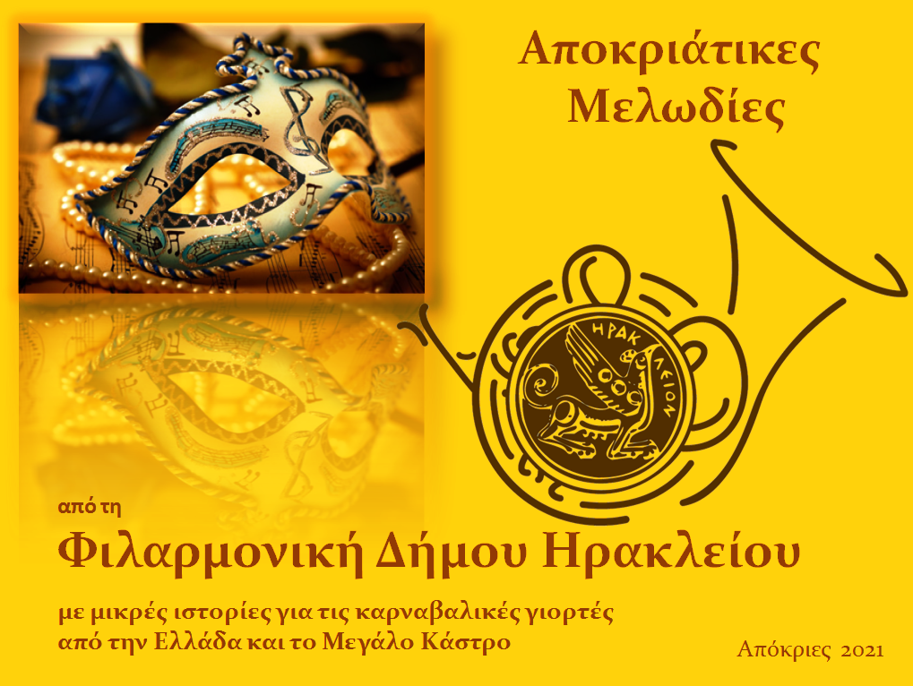 Η Φιλαρμονική Δήμου Ηρακλείου παρουσιάζοντας αποκριάτικες μελωδίες, μας προσκαλεί σε ένα ταξίδι με μουσικές του κόσμου και μικρές ιστορίες για τις καρναβαλικές γιορτές από την Ελλάδα και από το Μεγάλο Κάστρο του προηγούμενου αιώνα, σε αφήγηση της ιστορικού φιλολόγου Μαρίας Παναγιωτάκη.