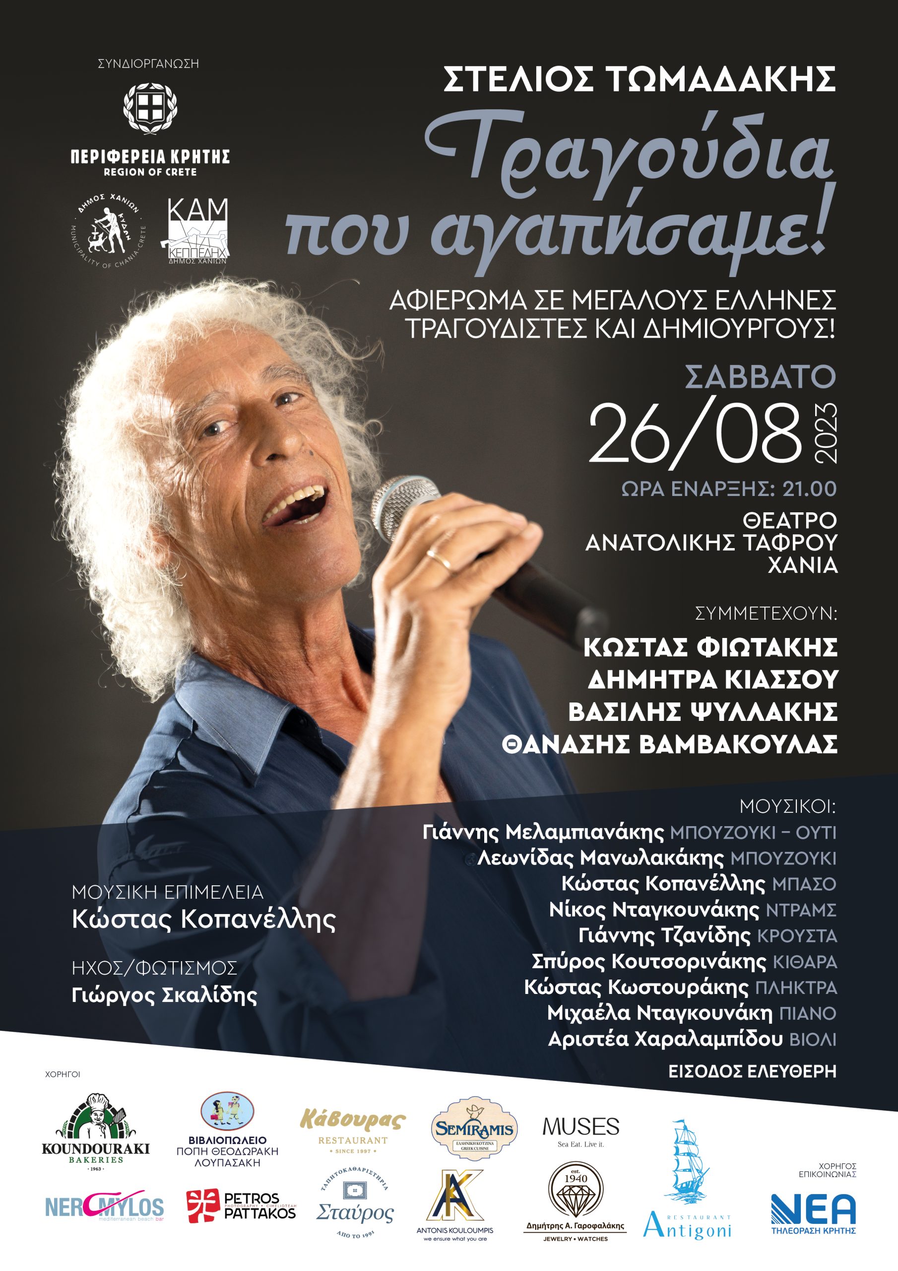 Ένα αφιέρωμα στους Μεγάλους Έλληνες Τραγουδιστές και Δημιουργούς με τίτλο «Τραγούδια που αγαπήσαμε» διοργανώνει η Περιφέρεια Κρήτης – Περιφερειακή Ενότητα Χανίων, με το Δήμο Χανίων και την ΚΕΠΠΕΔΗΧ – ΚΑΜ, το Σάββατο 26 Αυγούστου 2023, ώρα 21.00, στο Θέατρο της Ανατολικής Τάφρου.