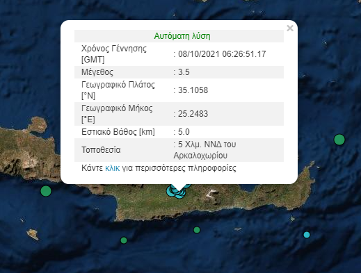 Ο σεισμός μεγέθους 3,5 Ρίχτερ σημειώθηκε 5 Χλμ. νότια νοτιοδυτικά του Αρκαλοχωρίου, και το εστιακό του βάθος υπολογίζεται στα 5 χλμ.
