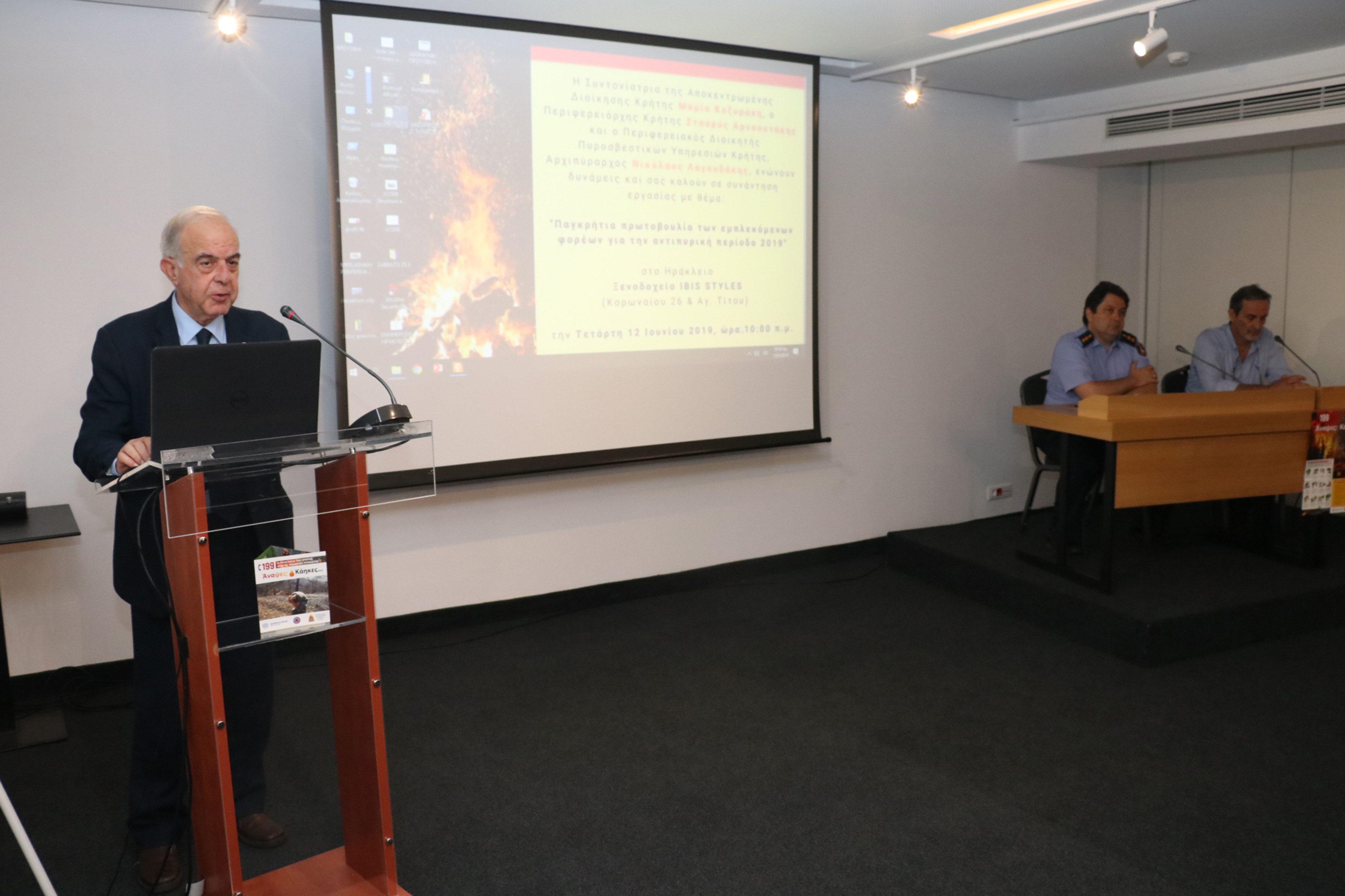 Η Περιφέρεια Κρήτης δημιουργεί ένα «δίχτυ» αντιπυρικής προστασίας για ολόκληρη την Κρήτη, χρηματοδοτώντας με περισσότερα από 8 εκ. ευρώ το Πυροσβεστικό Σώμα, ευρύτερα τα Σώματα Ασφαλείας στο νησί για ανανέωση εξοπλισμού ενώ μέσα από νεότερη πρόσκληση για οχήματα και εξοπλισμό 1,5 εκατομμυρίου, οι αρμόδιοι φορείς μπορούν να υποβάλουν προτάσεις για τη διαχείριση των πυρκαγιών. Αυτό τόνισε σήμερα ο Περιφερειάρχης Κρήτης Σταύρος Αρναουτάκης μιλώντας στην ενημερωτική εκδήλωση με θέμα «Παγκρήτια πρωτοβουλία των εμπλεκομένων φορέων για την αντιπυρική περίοδο 2019» που πραγματοποιήθηκε σε κεντρικό ξενοδοχείο του Ηρακλείου.