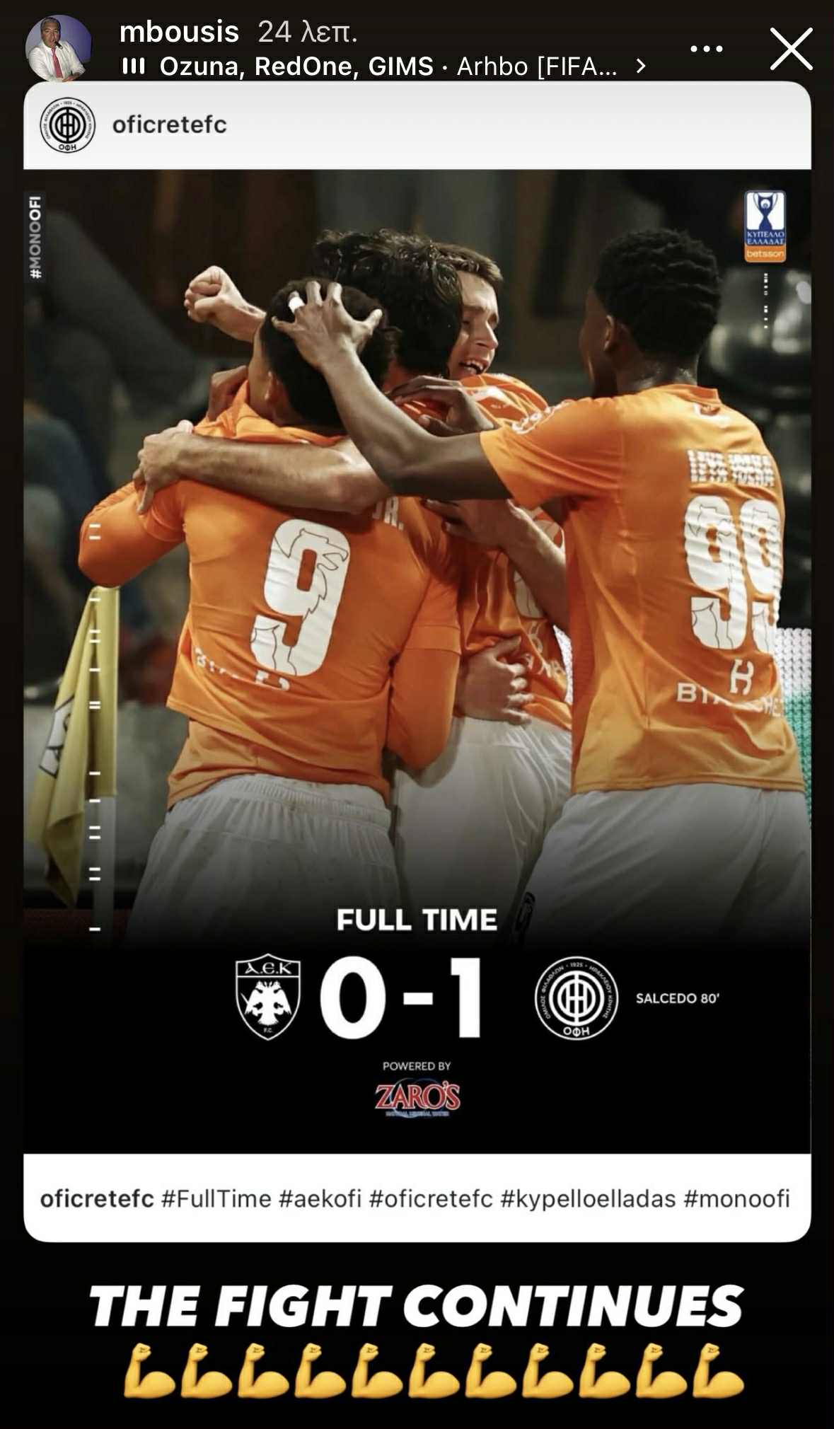 Στο αμέσως επόμενο story που δημοσίευσε με μια πανηγυρική φωτογραφία από τον επίσημο λογαριασμό της ΠΑΕ, τη συνόδευσε με τη φράση: “Η μάχη συνεχίζεται”.