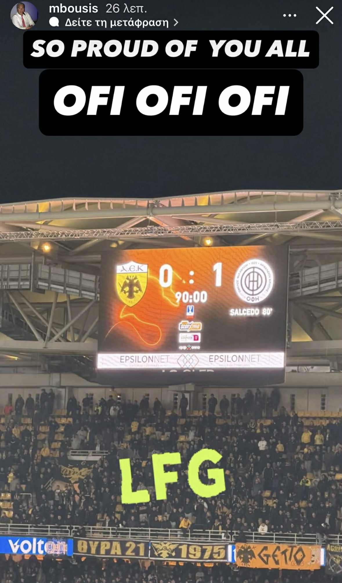 Ο ίδιος μέσα από Instagram Stories δήλωσε περήφανος για όλους με μια εικόνα από το ταμπλό του γηπέδου και το σκορ του ματς: