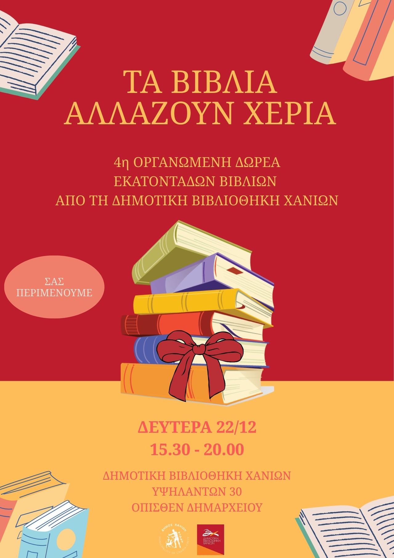 Εκατοντάδες βιβλία θα προσφέρει στο αναγνωστικό κοινό η Δημοτική Βιβλιοθήκη Χανίων, στο πλαίσιο της εκδήλωσης με τίτλο «Τα βιβλία αλλάζουν χέρια!». Η εκδήλωση θα πραγματοποιηθεί τη Δευτέρα 22 Δεκεμβρίου 2025, από τις 15:30 έως τις 20:00, στον χώρο του Αναγνωστηρίου της Βιβλιοθήκης (Υψηλαντών 30), σε μια δράση, που εντάσσεται στο εορταστικό, χριστουγεννιάτικο πνεύμα προσφοράς και αλληλεγγύης.