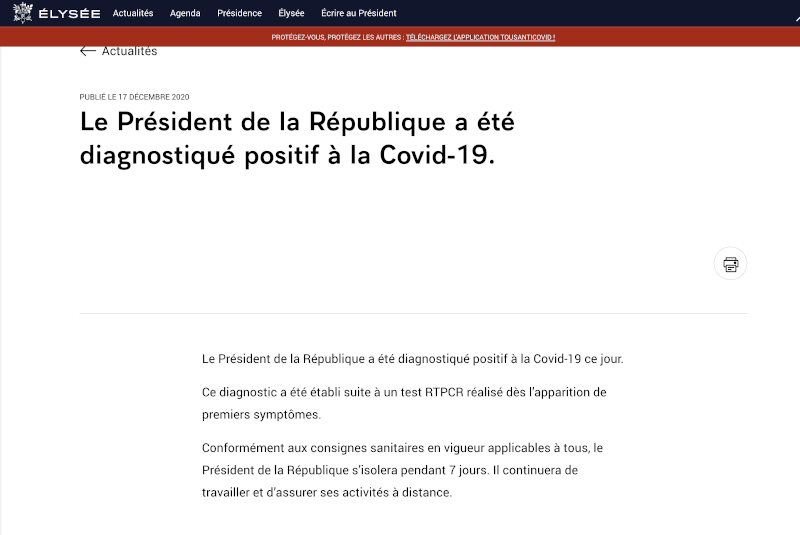 Η πρώτη κυρία της Γαλλίας, Μπριζίτ Μακρόν, είχε μπει σε καραντίνα τον περασμένο Οκτώβριο καθώς είχε έρθει σε επαφή με επιβεβαιωμένο κρούσμα, αλλά το προεδρικό ζεύγος της Γαλλίας είχε διαφύγει μέχρι τώρα τη μόλυνση. Στις αρχές της εβδομάδας το περιβάλλον του Μακρόν είχε διαβεβαιώσει τη γαλλική εφημερίδα Le Figaro, ότι ο Πρόεδρος είχε υποβληθεί αρκετές φορές σε εξετάσεις από την αρχή της πανδημίας, αλλά ουδέποτε διαγνώστηκε θετικός στον κορωνοϊό.