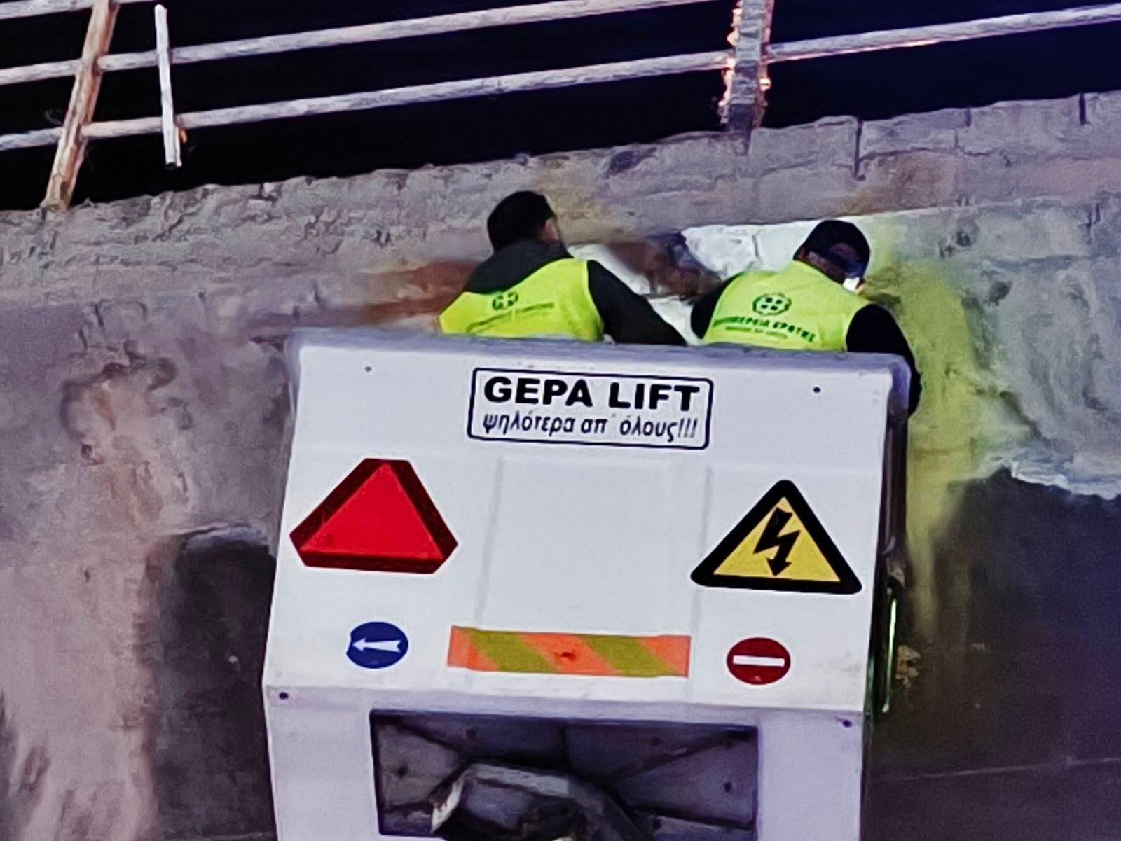 Με ειδικό ανυψωτικό μηχάνημα έλεγξαν το σημείο, αφαίρεσαν πέτρες είχαν αποκολληθεί ενώ δεν εντοπίστηκε σοβαρό θέμα.