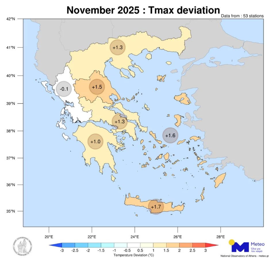 Σύμφωνα με το δίκτυο των 53 μετεωρολογικών σταθμών του meteo.gr του Εθνικού Αστεροσκοπείου Αθηνών (Ε.Α.Α.), που λειτουργούν ανελλιπώς από το 2010 έως σήμερα, τον Νοέμβριο του 2025 η μέση τιμή των μεγίστων ημερήσιων θερμοκρασιών κυμάνθηκε σε υψηλότερα για την εποχή επίπεδα σε όλα τα γεωγραφικά διαμερίσματα, εκτός από τη Δυτική Ελλάδα και τα νησιά του Ιονίου πελάγους, όπου καταγράφηκε ελαφρώς χαμηλότερη από τα κανονικά τιμή (σε σύγκριση με τον μέσο όρο της περιόδου 2010–2019).