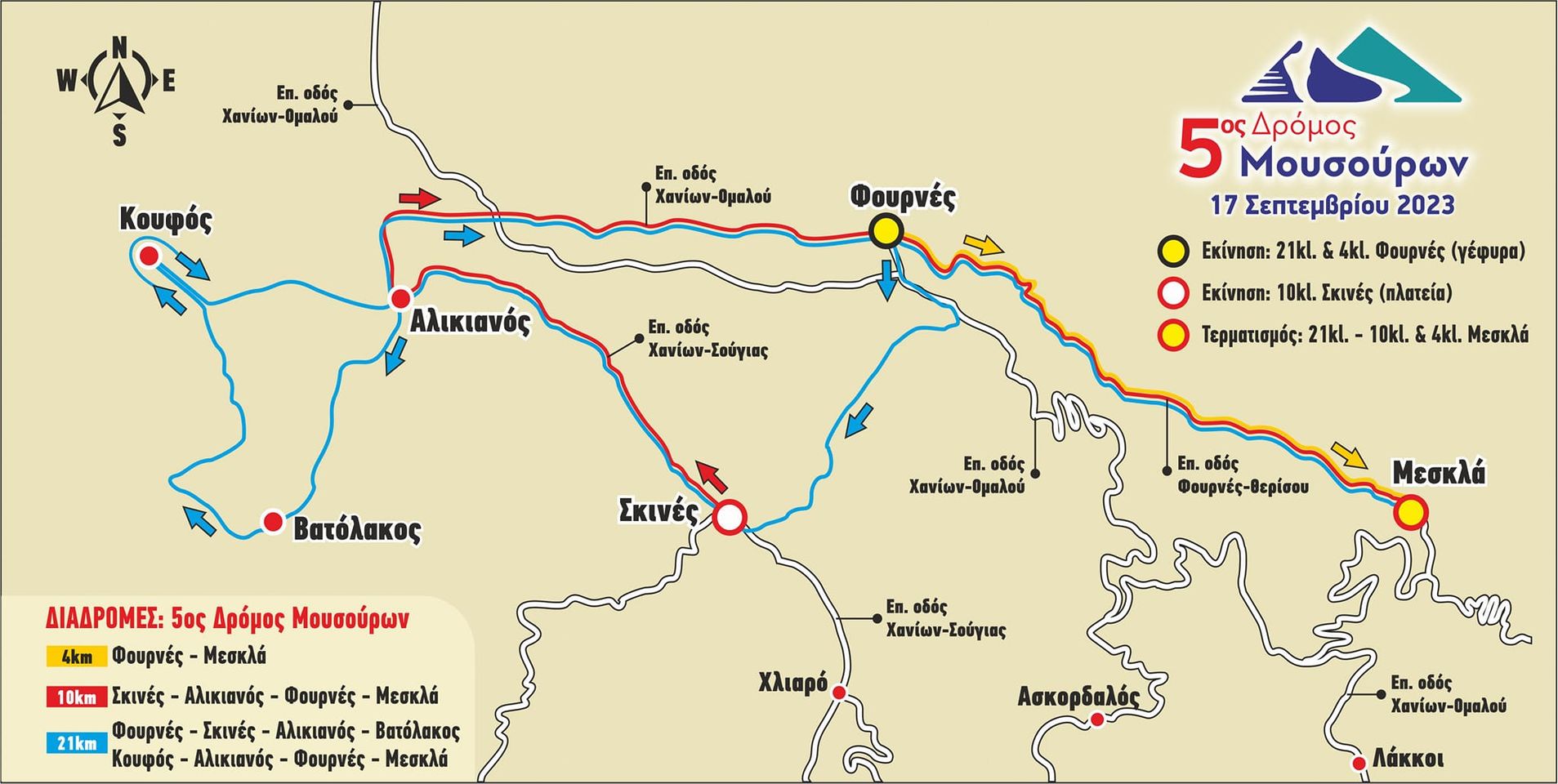 Ο Δήμος Πλατανιά, σε συνεργασία με το Σύλλογο Δρομέων Υγείας Χανίων και συνδιοργανωτή την Περιφέρεια Κρήτης, καθώς και την υποστήριξη της ΕΛΑΣ, του Ερυθρού Σταυρού και του ΣΥ.ΦΑ.Χ., ενημερώνουν ότι θα πραγματοποιηθεί για 5η χρονιά ο Αγώνας Δρόμου, με την επωνυμία “ 5ος Δρόμος Μουσούρων”, που θα διεξαχθεί την Κυριακή 17 Σεπτεμβρίου.