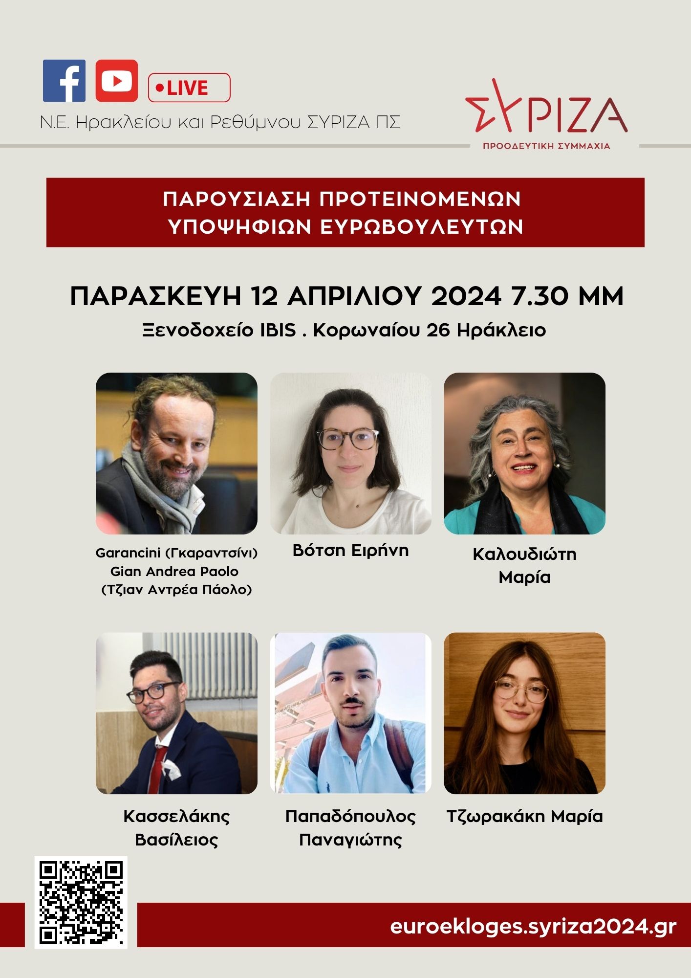 Την Παρασκευή 12/4/2024 και ώρα 19:30 θα γίνει η εκδήλωση παρουσίασης των υποψηφίων της Κρήτης για τη συμμετοχή τους στο Ευρωψηφοδέλτιο, στο ξενοδοχείο IBIS STYLES CENTRAL ( Κορωναίου 26 ).