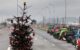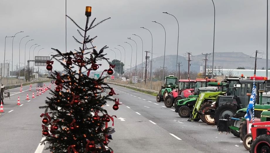 Ανάμεσα στα τρακτέρ που έχουν παραταχθεί στο δρόμο και τις σκηνές που έχουν στήσει οι αγρότες για να περνούν τις νύχτες τους, δεσπόζει ένα στολισμένο χριστουγεννιάτικο δέντρο.