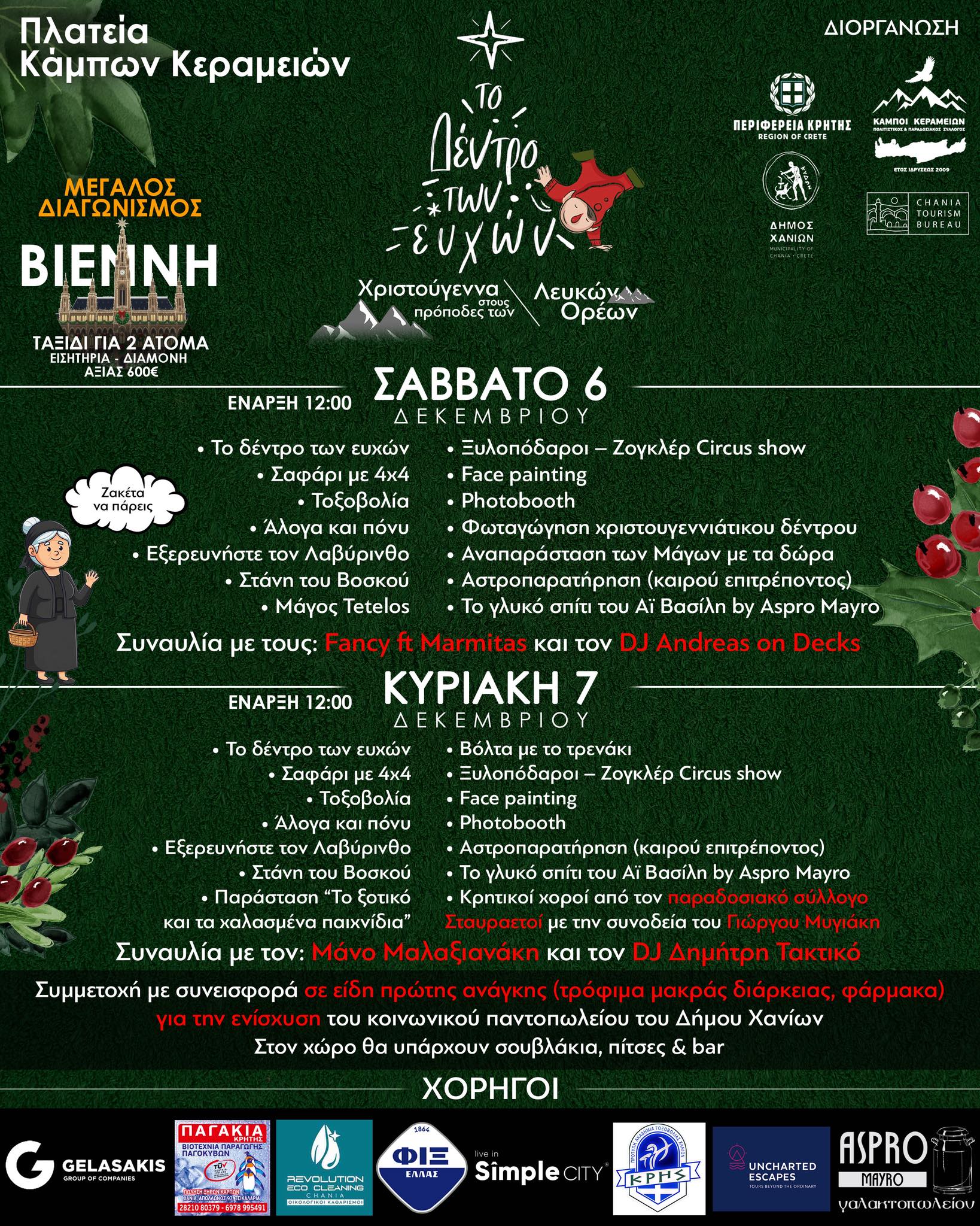 Ο Δήμος Χανίων και ο Πολιτιστικός Σύλλογος Κάμπων διοργανώνουν «Το Δέντρο των Ευχών», τη μεγάλη χριστουγεννιάτικη γιορτή της χανιώτικης ενδοχώρας, η οποία επιστρέφει φέτος ανανεωμένη, φωτεινή και γεμάτη μαγεία.