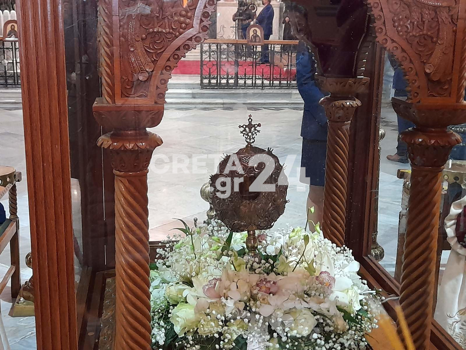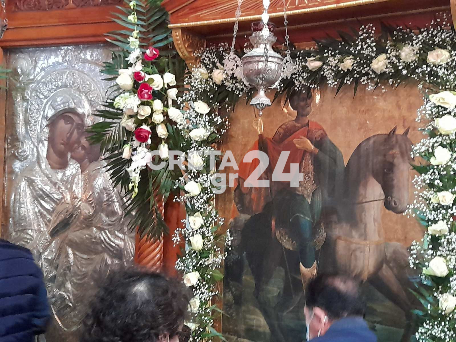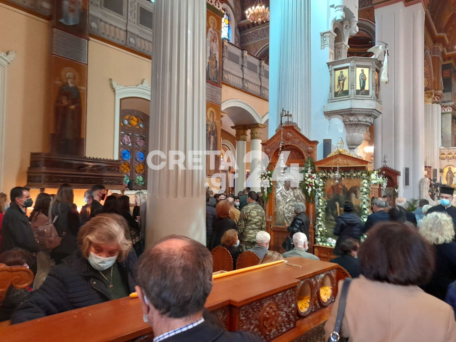 Το πρωί τελέστηκε Αρχιερατική Θεία Λειτουργία ενώ στη συνέχεια ακολούθησε λιτάνευση της εικόνας του Αγίου, με μια διαφορετική σε σχέση με τα προηγούμενα χρόνια πορεία λόγω των έργων που εκτελούνται στην 1821, περνώντας από την Κατεχάκη, την Λεωφόρο Καλοκαιρινού και επιστρέφοντας από την Αγίου Μηνά στο ναό.