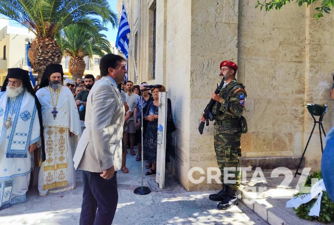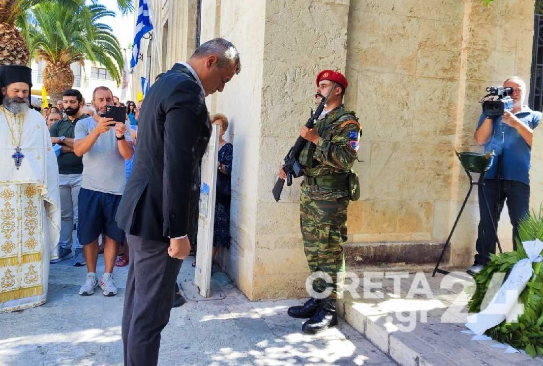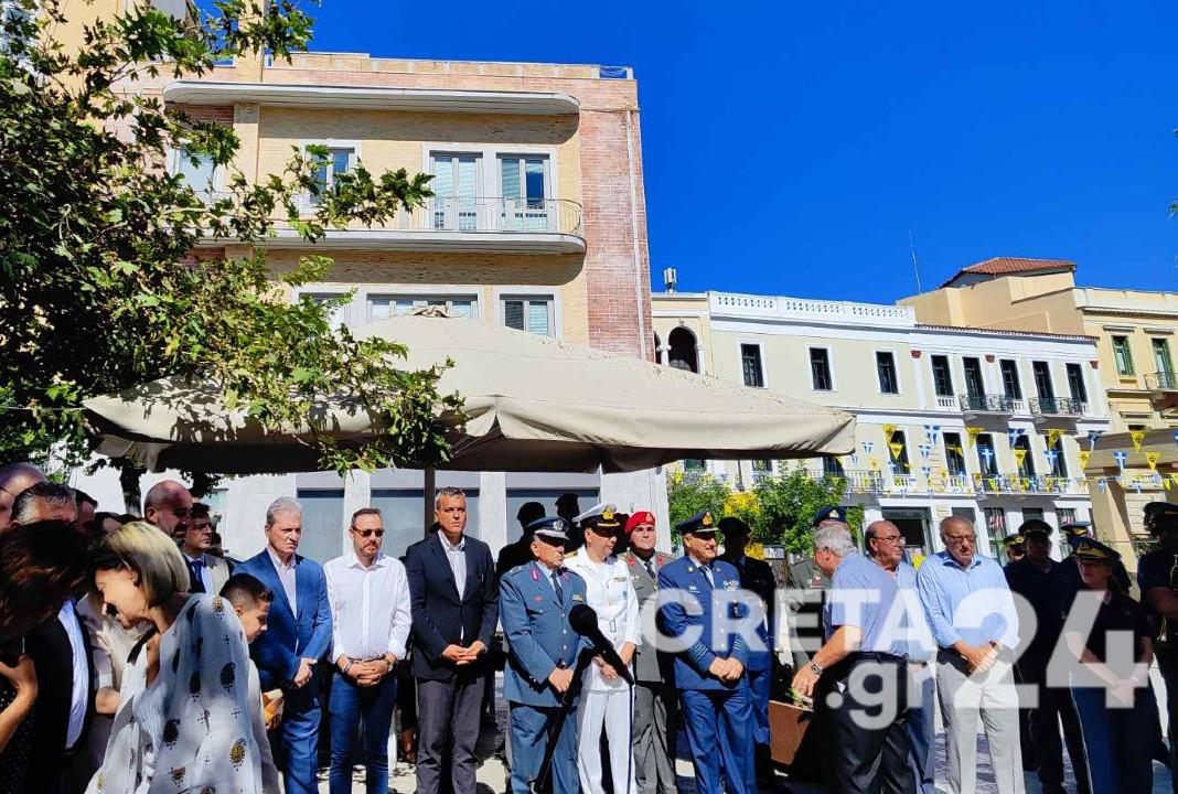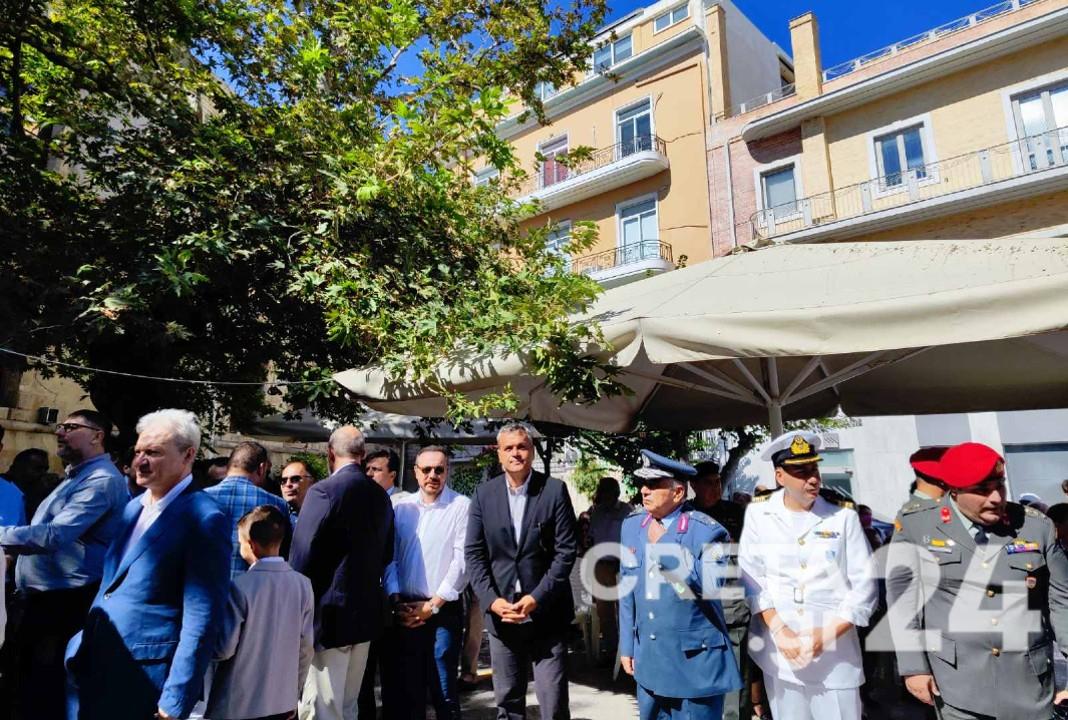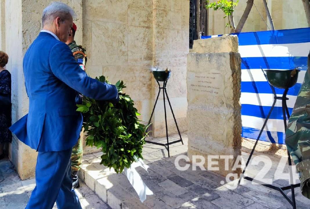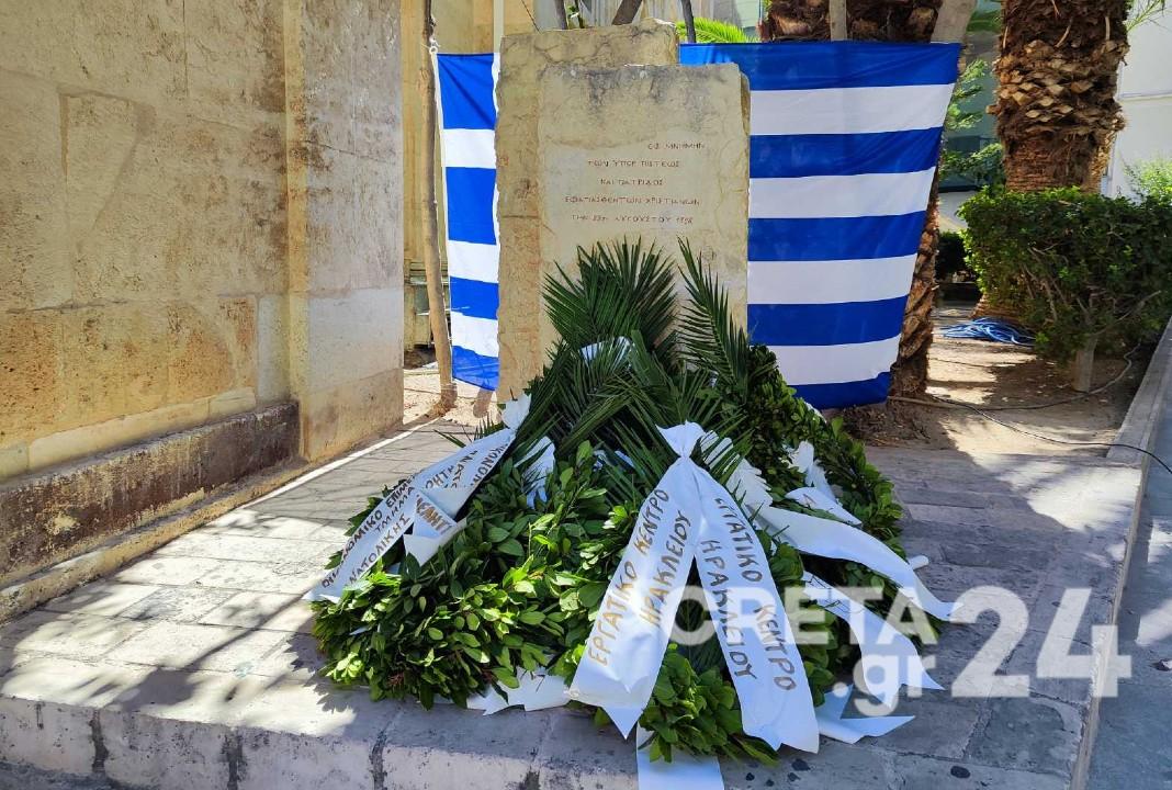 Ακολούθησε κατάθεση στεφάνων από τον Δήμαρχο Ηρακλείου Αλέξη Καλοκαιρινό, τους Βουλευτές Ηρακλείου Μάξιμο Σενετάκη, Χάρη Μαμουλάκη, Φραγκίσκο Παρασύρη και Μιχάλη Γαυγιωτάκη, τον Αντιπεριφερειάρχη Π.Ε. Ηρακλείου Νίκο Συριγωνάκη, εκπροσώπους των Ενόπλων Δυνάμεων, των Σωμάτων Ασφαλείας, των Συλλόγων Αποστράτων Αξιωματικών Στρατού Ξηράς και Αεροπορίας, του Οικονομικού Επιμελητηρίου Ελλάδας – Τμήμα Ανατολικής Κρήτης και του Εργατικού Κέντρου Ηρακλείου.