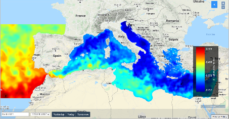 Η MARINOMICA παρέχει προβλέψεις για την εξέλιξη της παλίρροιας, καθώς και οπτικό υλικό από την περιοχή της Μεσογείου όπως την κάτωθι εικόνα που λήφθηκε στις 06/03. Η ένταση των χρωμάτων της μπάρας από πάνω προς τα κάτω δίνει και την ένταση της άμπωτης στη περιοχή, με τον παλιρροιογράφο στο Θρακικό πέλαγος να μετρά περί τα 45 εκ. πτώση, και γενικά περί τα 40 εκ. στις βόρειες και περί τα 20-25 στις νότιες ακτές της Μεσογείου.