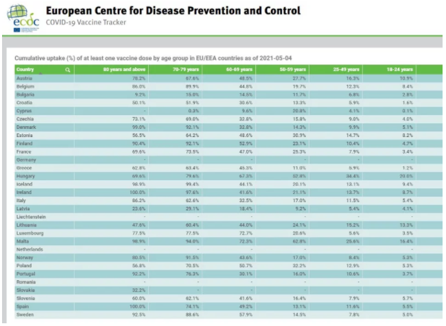Οι εμβολιασμοί στην Ελλάδα -όπως και στην υπόλοιπη Ευρωπαϊκή Ενωση- προχωρούν με γοργούς ρυθμούς, ωστόσο από τα στοιχεία του ECDC (European Centre for Disease Prevention and Control) προκύπτουν ενδιαφέροντα στοιχεία για τη συμπεριφορά των ηλικιακών ομάδων έναντι του εμβολίου.