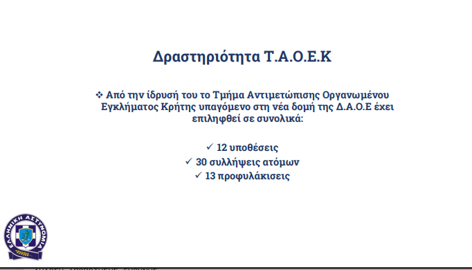 Παράλληλα στην παρουσίαση της δράση του ΤΑΟΕΚ γίνεται αναφορά και στις σημαντικότερες υποθέσεις με τις οποίες ασχολήθηκε το τελευταίο 8μηνο: