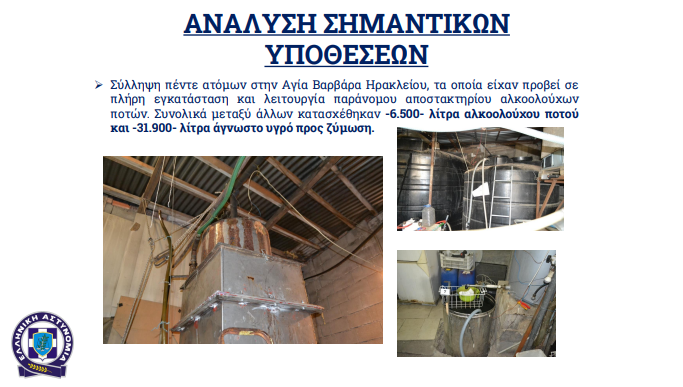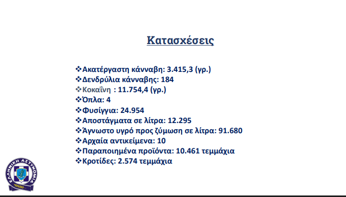 12 υποθέσεις, 30 συλλήψεις 13 προφυλακίσεις, είναι το αποτέλεσμα της δράσης του οργανωμένου εγκλήματος στο νησί το οποίο στο πλαίσιο των επιχειρήσεων του κατέσχεσε ποσότητες ναρκωτικών, αλκοολούχων ποτών και απομιμητικών προϊόντων αλλά και όπλα, αρχαία αντικείμενα και κροτίδες.