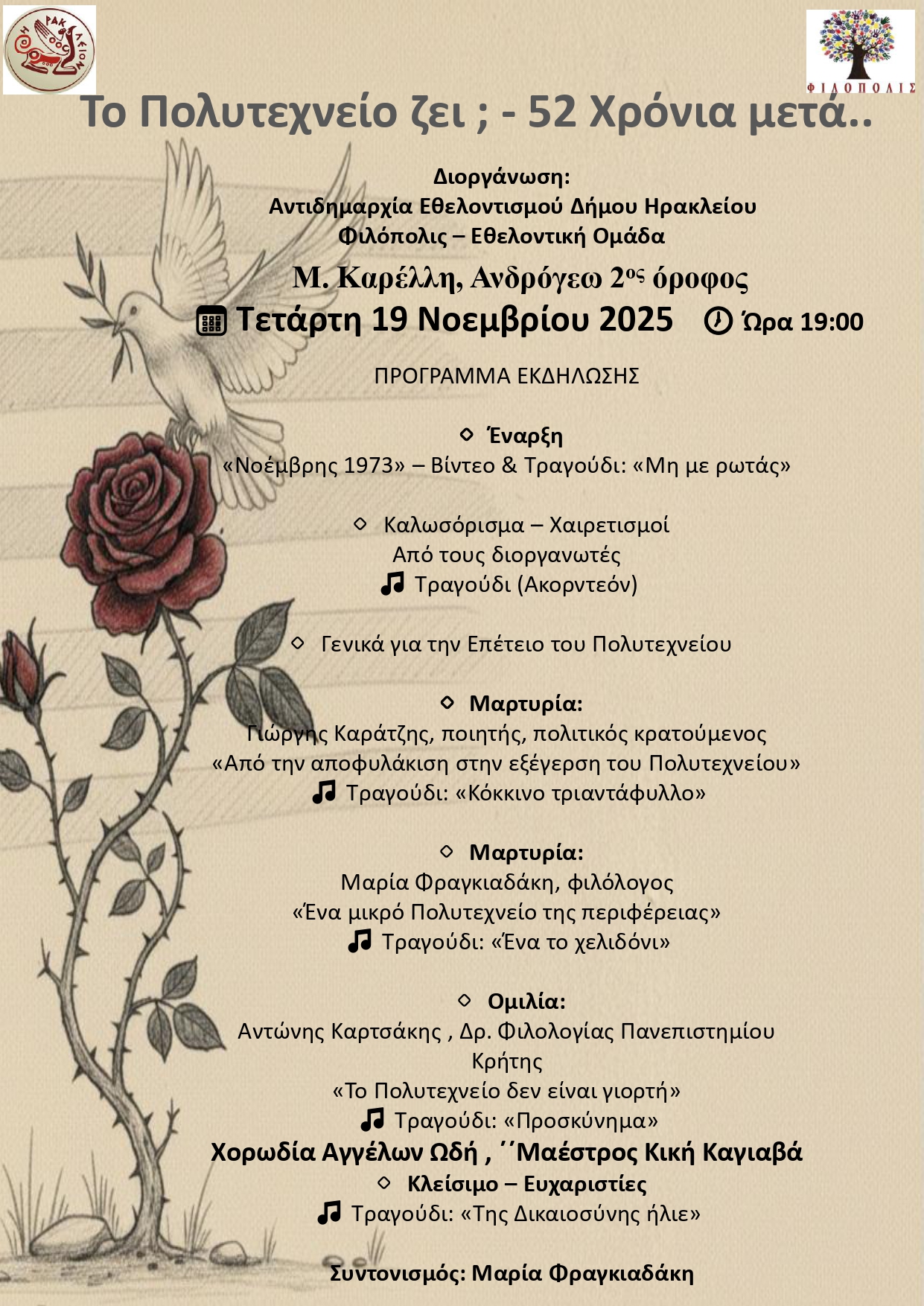 Με αφορμή την επέτειο από την εξέγερση του Πολυτεχνείου στις 17 Νοεμβρίου 1973, ο Δήμος Ηρακλείου-Αντιδημαρχία Εθελοντισμού και η Εθελοντική Ομάδα «Φιλόπολις», διοργανώνουν εκδήλωση με τίτλο «Το Πολυτεχνείο ζει; 52 χρόνια μετά».