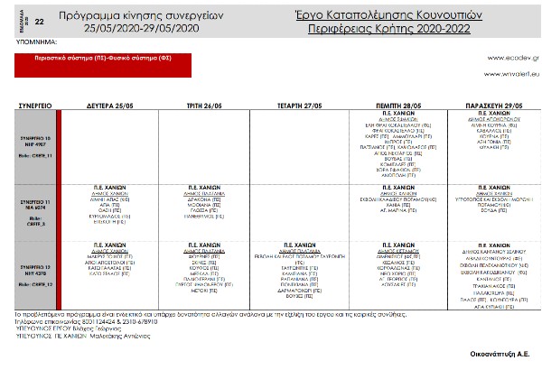 Ανακοινώθηκε το πρόγραμμα εφαρμογών καταπολέμησης κουνουπιών – κίνησης συνεργείων από 25 έως 29/05/2020 από τη Δ/νση Δημόσιας Υγείας & Κοινωνικής Μέριμνας Π.Ε. Χανίων / Τμήμα Περιβαλλοντικής Υγιεινής & Υγειονομικού Ελέγχου.