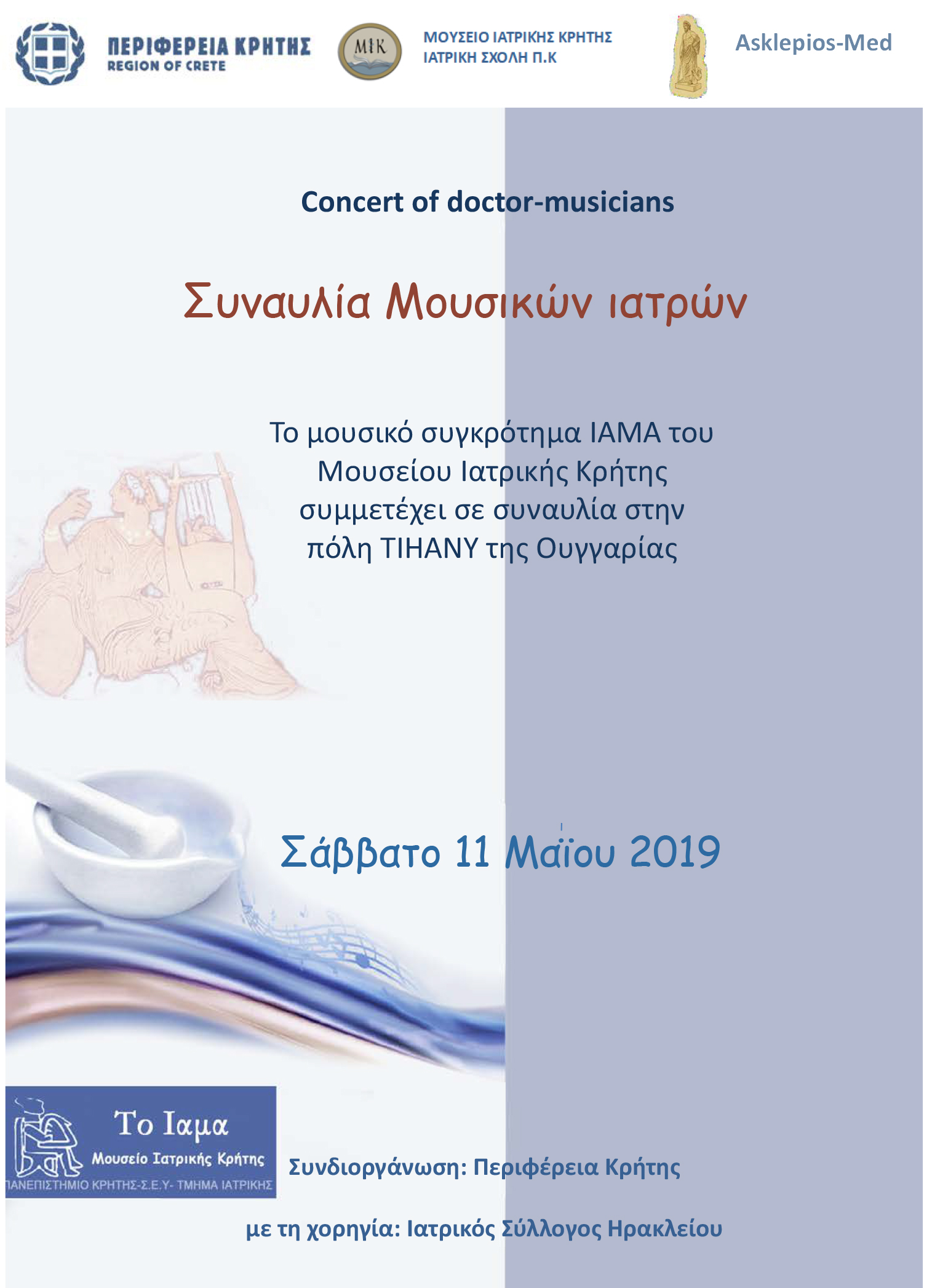 Το μουσικό σχήμα του Μουσείου Ιατρικής Κρήτης «ΙΑΜΑ» θα εκπροσωπήσει την Ελλάδα στο διεθνές φεστιβάλ μουσικών συγκροτημάτων που απαρτίζονται από γιατρούς, το οποίο θα πραγματοποιηθεί στην πόλη Tihany της Ουγγαρίας, το Σάββατο 11/5/2019.