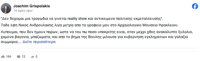 Ο κ. Γρυσπολάκης, σε προσωπική του ανάρτηση μεν αλλά ως…πρόεδρος του Μουσείου προφανώς, σχολίασε απρεπώς την χθεσινή δήλωση του κ. Ανδρουλάκη από το Ηράκλειο, στην οποία ο πρόεδρος του ΠΑΣΟΚ ανέφερε για το θέμα των Βοριζίων ότι «μια τραγωδία δεν μπορεί να γίνεται reality show και αντικείμενο πολιτικής εκμετάλλευσης».