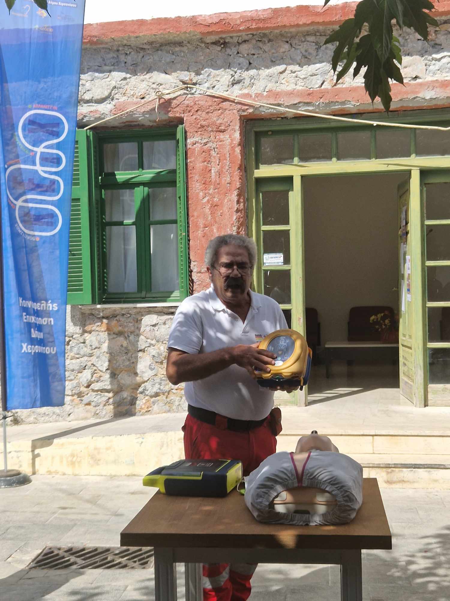Παράλληλα, πραγματοποιήθηκε ενημέρωση – επίδειξη καρδιοπνευμονικής αναζωογόνησης (ΚΑΡΠΑ) με τη χρήση αυτόματου εξωτερικού απινιδωτή από το Σώμα Εθελοντών Σαμαρειτών, Διασωστών και Ναυαγοσωστών του Περιφερειακού Τμήματος Ε.Ε.Σ. Ηρακλείου.