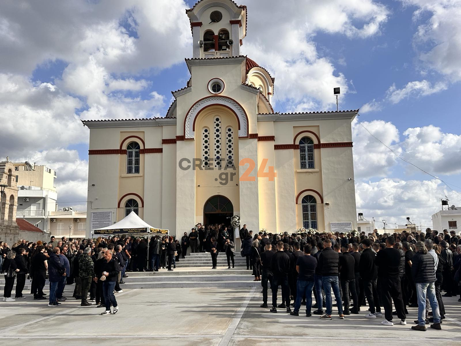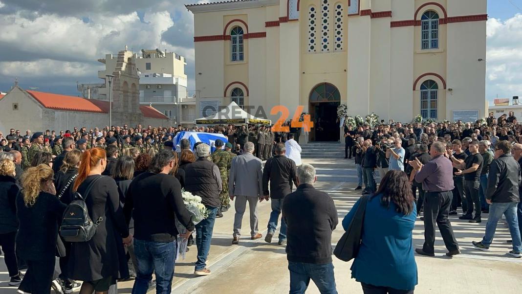 Η κηδεία του 19χρονου τελείται στον τόπο καταγωγής του, το Τυμπάκι και στον ιερό ναό του Αγίου Τίτου, όπου από νωρίς το πρωί βρέθηκαν άνθρωποι που τον γνώριζαν για να του πουν το τελευταίο αντίο.