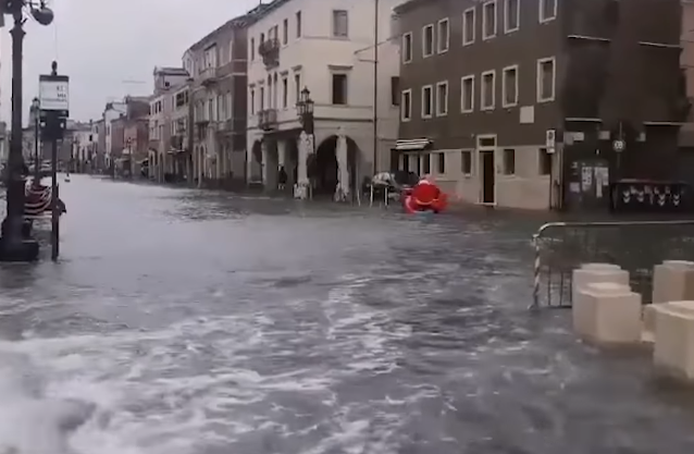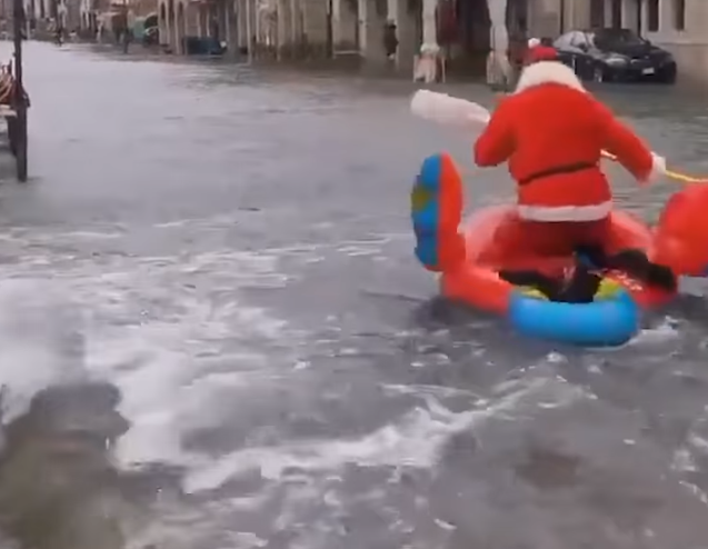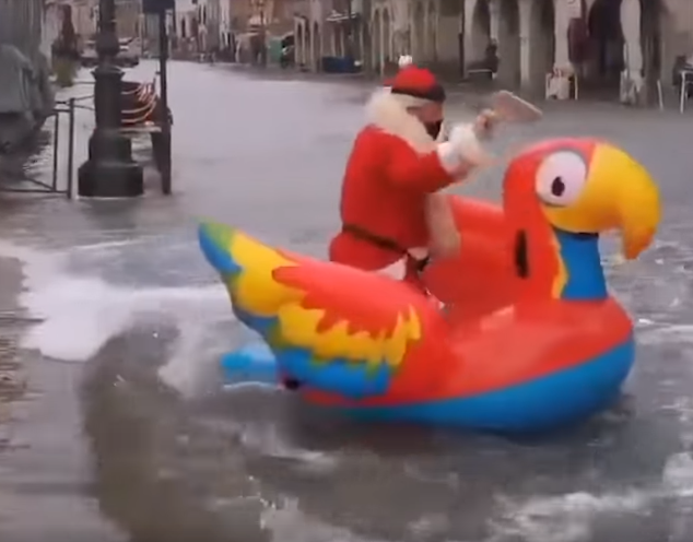 Η έντονα κακοκαιρία στην γραφική πόλη της Ιταλίας προκάλεσε πολλά προβλήματα στις μετακινήσεις των κατοίκων, με ορισμένους πάντως να είναι ευρηματικοί, όπως για παράδειγμα ένας πολίτης που ντύθηκε Αγιος Βασίλης. Προκειμένου να μετακινηθεί αποφάσισε να πάρει έναν… φουσκωτό παπαγάλο βγαίνοντας βόλτα στα πλημμυρισμένα κανάλια.