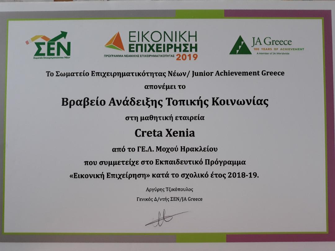 Μεταξύ 160 μαθητικών «επιχειρήσεων» που συμμετείχαν φέτος στο πρόγραμμα της Μαθητικής Εικονικής Επιχείρησης του Σωματείου Επιχειρηματικότητας Νέων/Junior Achievement Greece, η Creta Xenia Authentic Experiences του ΓΕΛ ΜΟΧΟΥ διακρίθηκε με το βραβείο Ανάδειξης Τοπικής Κοινωνίας στον 14ο Πανελλαδικό Τελικό Διαγωνισμό «καλύτερη μαθητική εικονική επιχείρηση 2019».