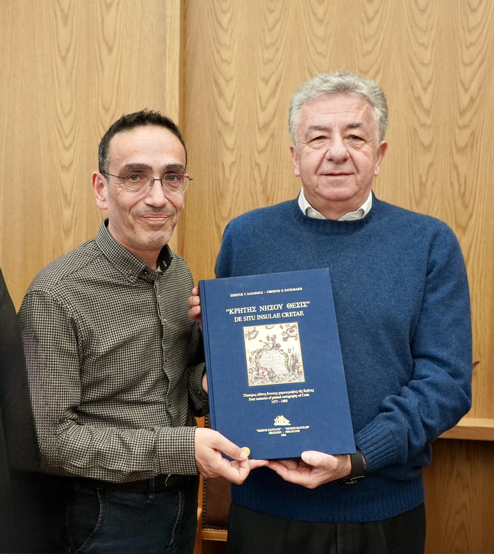 Ο Σταύρος Αρναουτάκης παρέδωσε στον Γραμματέα το αναμνηστικό δώρο, το οποίο είναι η συλλεκτική χαρτογραφική έκδοση «ΚΡΗΤΗΣ ΝΗΣΟΥ ΘΕΣΙΣ» (De Situ Insulae Cretae). Ο Περιφερειάρχης ευχήθηκε στον Δημήτρη Βρύσαλη καλή χρονιά, δημιουργική και διεκδικητική, τονίζοντας τη σημασία της καλής συνεργασίας στο Περιφερειακό Συμβούλιο για το καλό του τόπου.