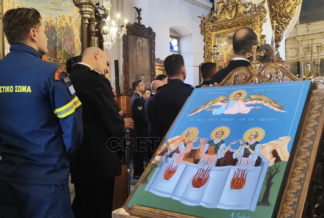 Στα Χανιά οι πυροσβέστες τίμησαν τους προστάτες Αγίους, Ανανία, Αζαρία και Μισαήλ, με δοξολογία που τελέστηκε το πρωί στον Μητροπολιτικό Ναό Εισοδίων της Θεοτόκου.