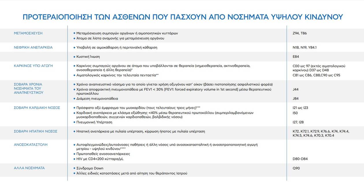Σε ό,τι αφορά την προτεραιοποίηση των ευπαθών ομάδων πληθυσμού θα προηγηθούν οι εξής κατηγορίες ασθενών: