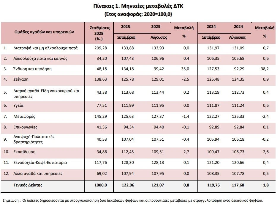Συγκεκριμένα, από τη σύγκριση του Γενικού ΔΤΚ του μηνός Σεπτεμβρίου 2025 με τον αντίστοιχο Δείκτη του Σεπτεμβρίου 2024 προέκυψε αύξηση 1,9% έναντι αύξησης 2,9% που σημειώθηκε κατά την αντίστοιχη σύγκριση του έτους 2024 με το 2023.